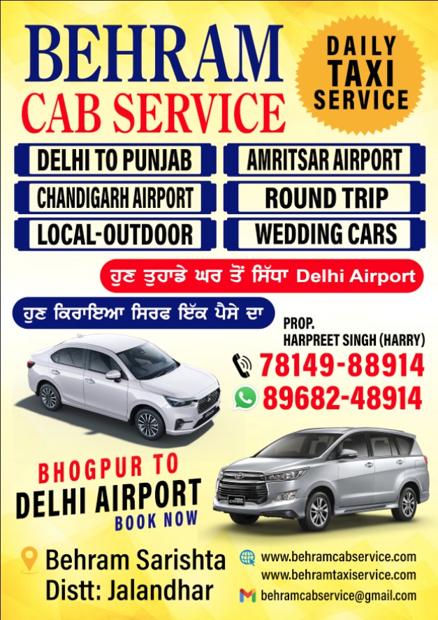 DELHI AIRPORT 24/7 TAXIWELCOME TO BEHRAM CAB CALL 78149-88914 Looking for a safe, reliable and affordable cab service to take you on a trip out of the city? Behram cabs are there for you! Company Name CHOOSE RIDE SEDAN CAR 5-SEATERBook your comfortable 5-seater ride now – easy, fast, and reliableCALL US SUV 7-SEATER Travel together made easy – reserve your 7-seater now.CALL US ONE WAY / UPDOWN PICKUP – DROPJALANDHAR TO DELHIDELHI TO BHOGPURSERVICE AVAILABILITY – GORAYA, PHAGWARA, JALANDHAR, KARTARPUR, HOSHIARPUR, BULHOWAL, TANDA, BHOGPUR, DASUYA, MUKERIANCALL US WEDDING / DAY TAXILuxury & Well Maintained Affordable Cars Available.High class passenger safety and convenience for LOCAL and Demanded AreasCALL US